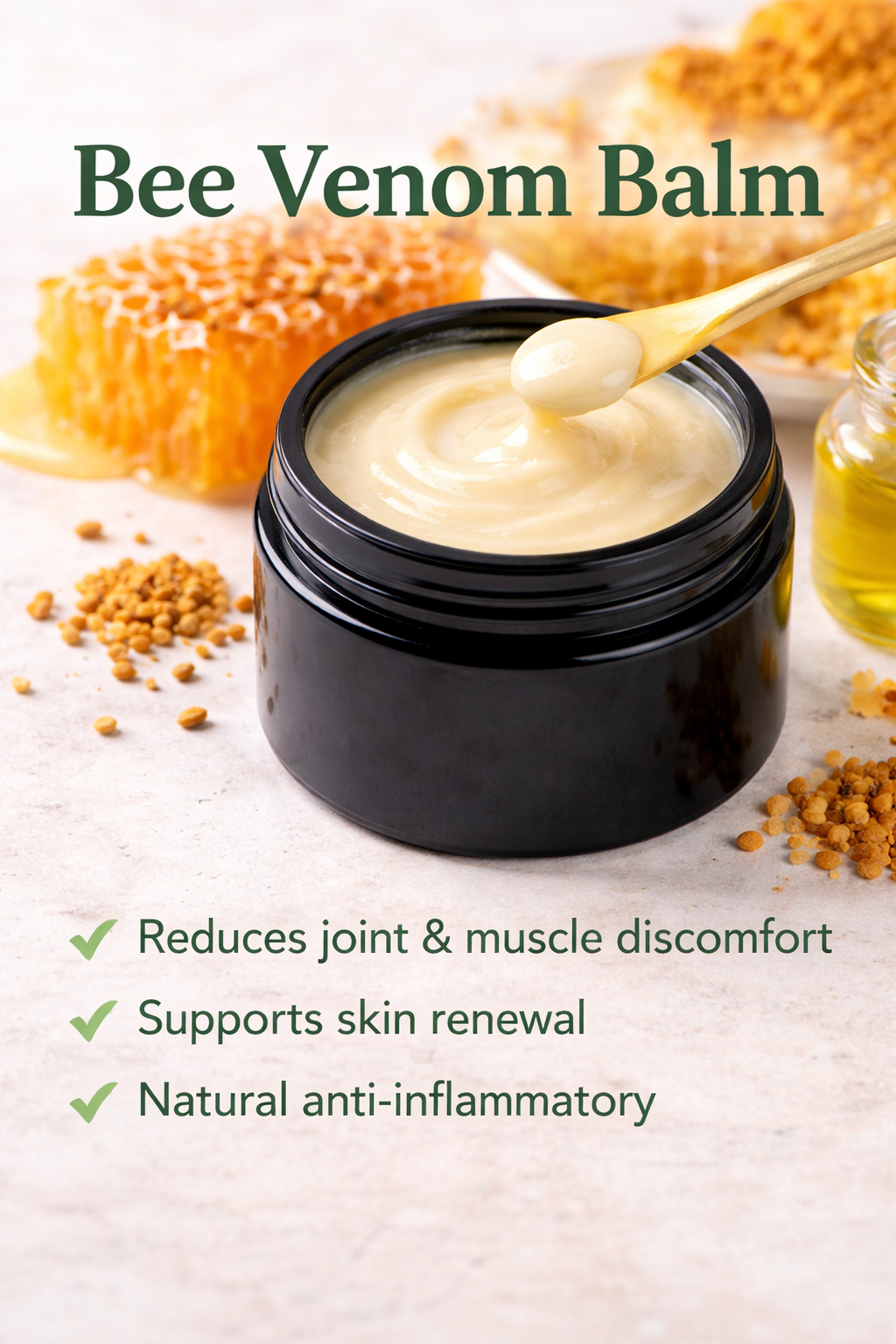 Formulated with purified bee venom, natural beeswax, honey, and carefully selected botanical oils. Inspired by traditional apitherapy practices, this balm is designed to support skin vitality and provide soothing comfort for muscles and joints.